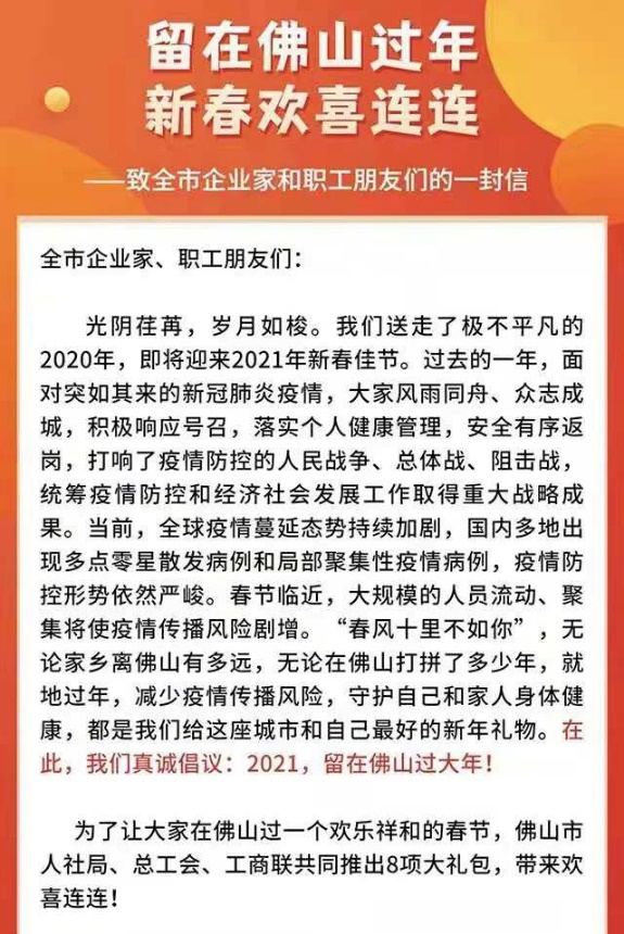 12日,佛山市多部門聯(lián)合推出8項禮包,號召廣大職工盡量留在佛山度過一個歡樂祥和的春節(jié)。