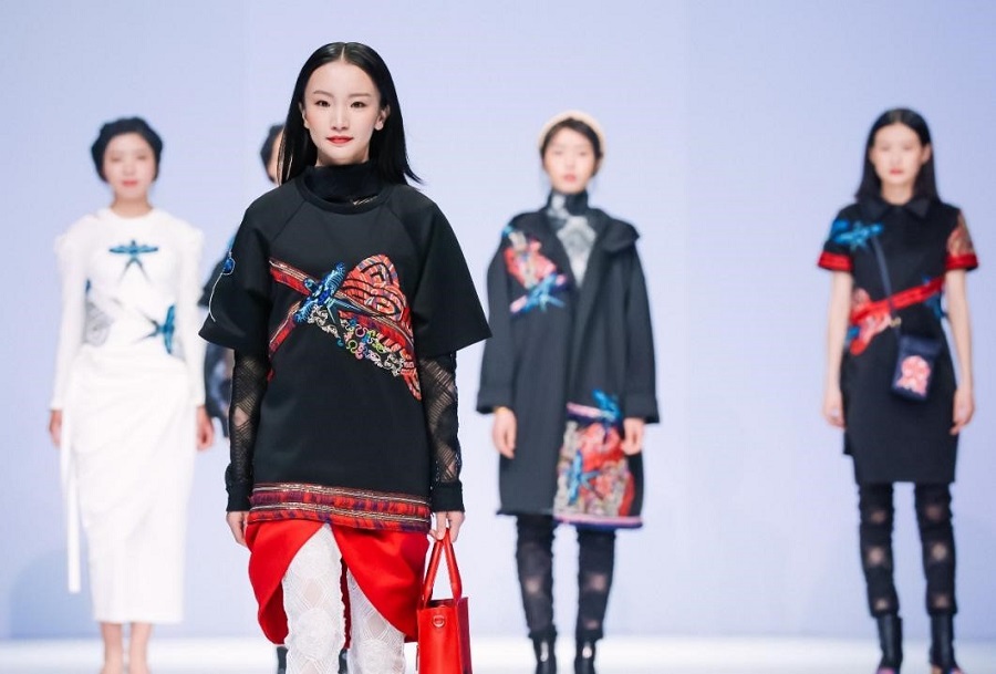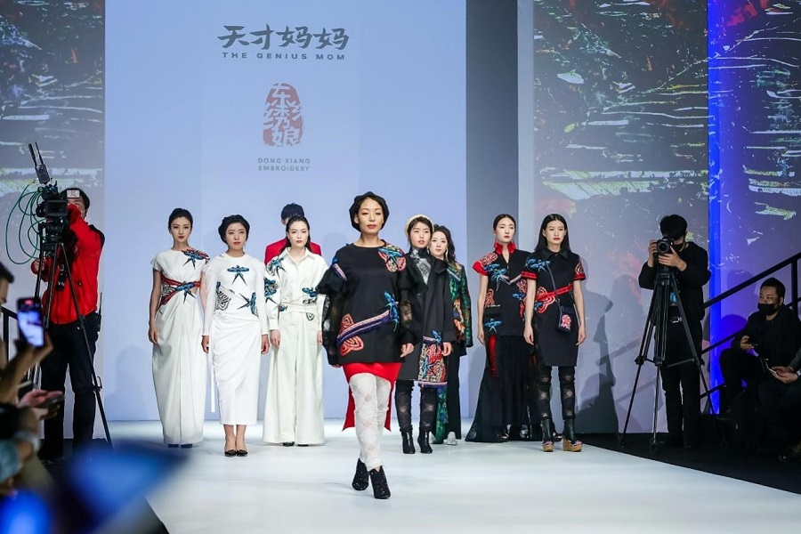 公益時(shí)裝秀以“民族等于潮流”為設(shè)計(jì)主題,將東鄉(xiāng)繡娘的民族傳統(tǒng)繡片與現(xiàn)代電腦印花及繡花結(jié)合貫穿整場(chǎng)發(fā)布。