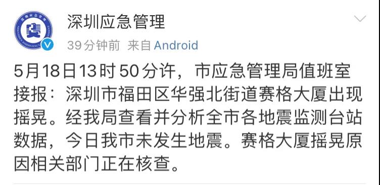 央廣網(wǎng)廣州5月18日消息(記者 楊振、周羽、郭翔宇、孫冰、王倩)今日中午13時50分許,深圳市福田區(qū)華強(qiáng)北街道賽格大廈出現(xiàn)晃動,引發(fā)外界高度關(guān)注。深圳市應(yīng)急管理局方面表示,大樓搖晃原因正在核查中,目前已排除地震。