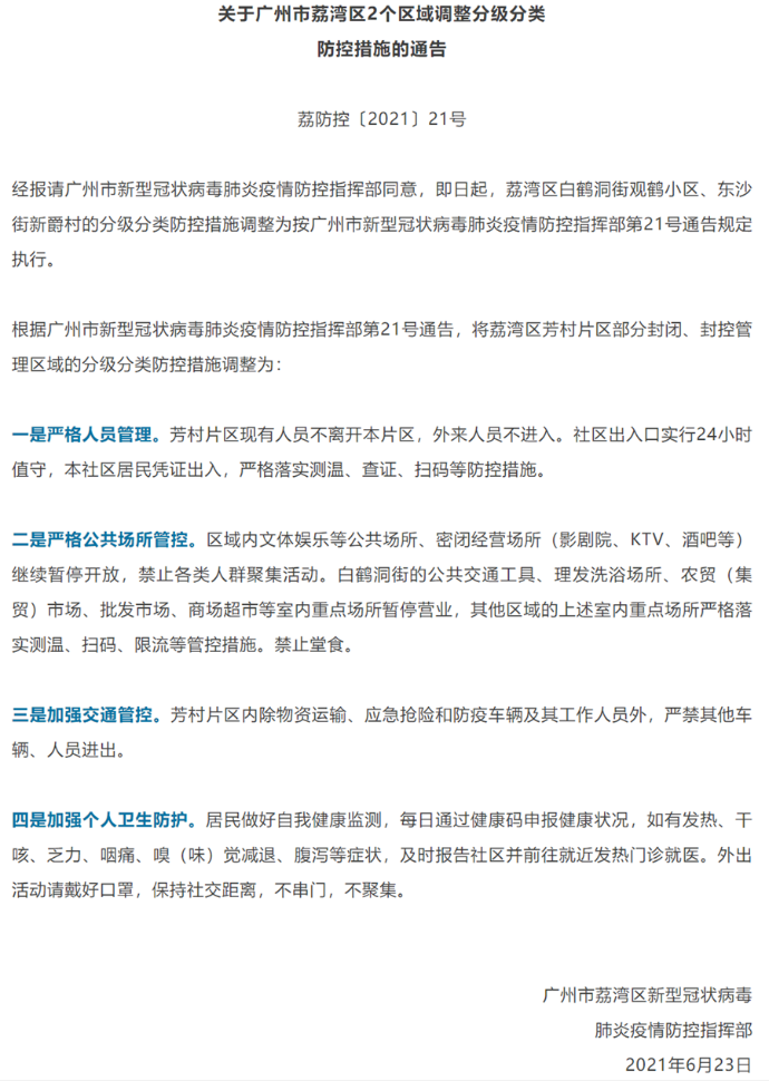 央廣網(wǎng)廣州6月23日消息(記者張勝?gòu)?qiáng))6月23日,廣州市荔灣區(qū)新型冠狀病毒肺炎疫情防控指揮部發(fā)布通告,即日起,調(diào)整荔灣區(qū)白鶴洞街觀鶴小區(qū)、東沙街新爵村的分級(jí)分類防控措施。