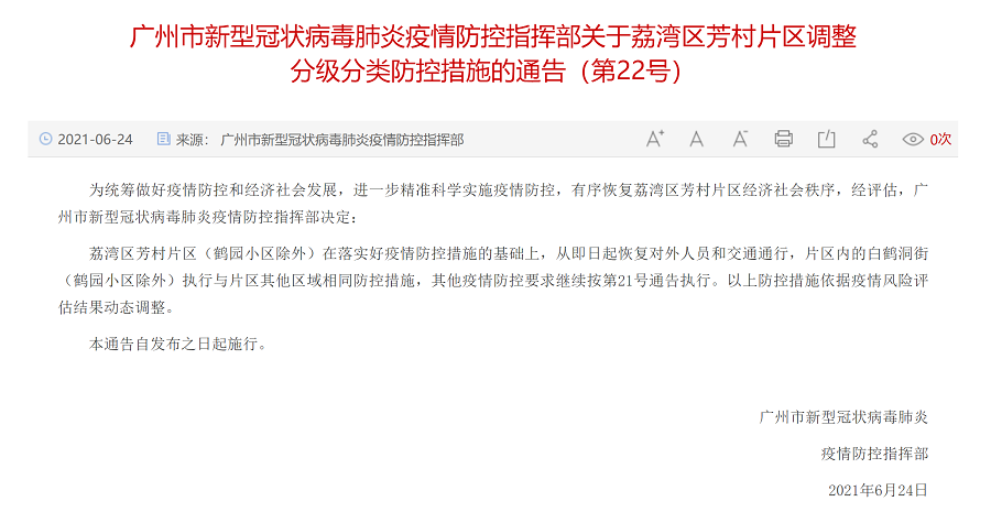 央廣網(wǎng)廣州6月24日消息(記者 張勝?gòu)?qiáng))6月24日下午,廣州市新型冠狀病毒肺炎疫情防控指揮部發(fā)布荔灣區(qū)芳村片區(qū)調(diào)整分級(jí)分類防控措施的通告(第22號(hào)),通告指出,荔灣區(qū)芳村片區(qū)(鶴園小區(qū)除外)在落實(shí)好疫情防控措施的基礎(chǔ)上,從即日起恢復(fù)對(duì)外人員和交通通行,片區(qū)內(nèi)的白鶴洞街(鶴園小區(qū)除外)執(zhí)行與片區(qū)其他區(qū)域相同防控措施,其他疫情防控要求繼續(xù)按第21號(hào)通告執(zhí)行。以上防控措施依據(jù)疫情風(fēng)險(xiǎn)評(píng)估結(jié)果動(dòng)態(tài)調(diào)整。