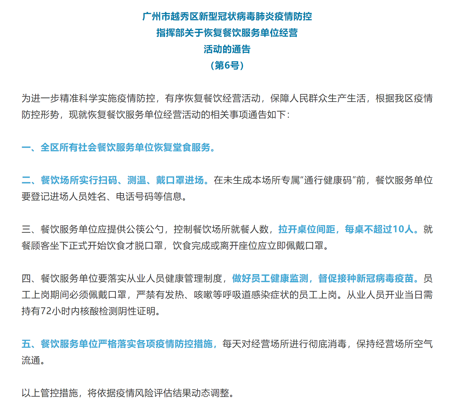 五、全區(qū)所有社會(huì)餐飲單位(含提供堂食的食品銷售單位)恢復(fù)堂食服務(wù)的從業(yè)人員,開業(yè)當(dāng)日需持有72小時(shí)內(nèi)核酸檢測(cè)陰性證明。