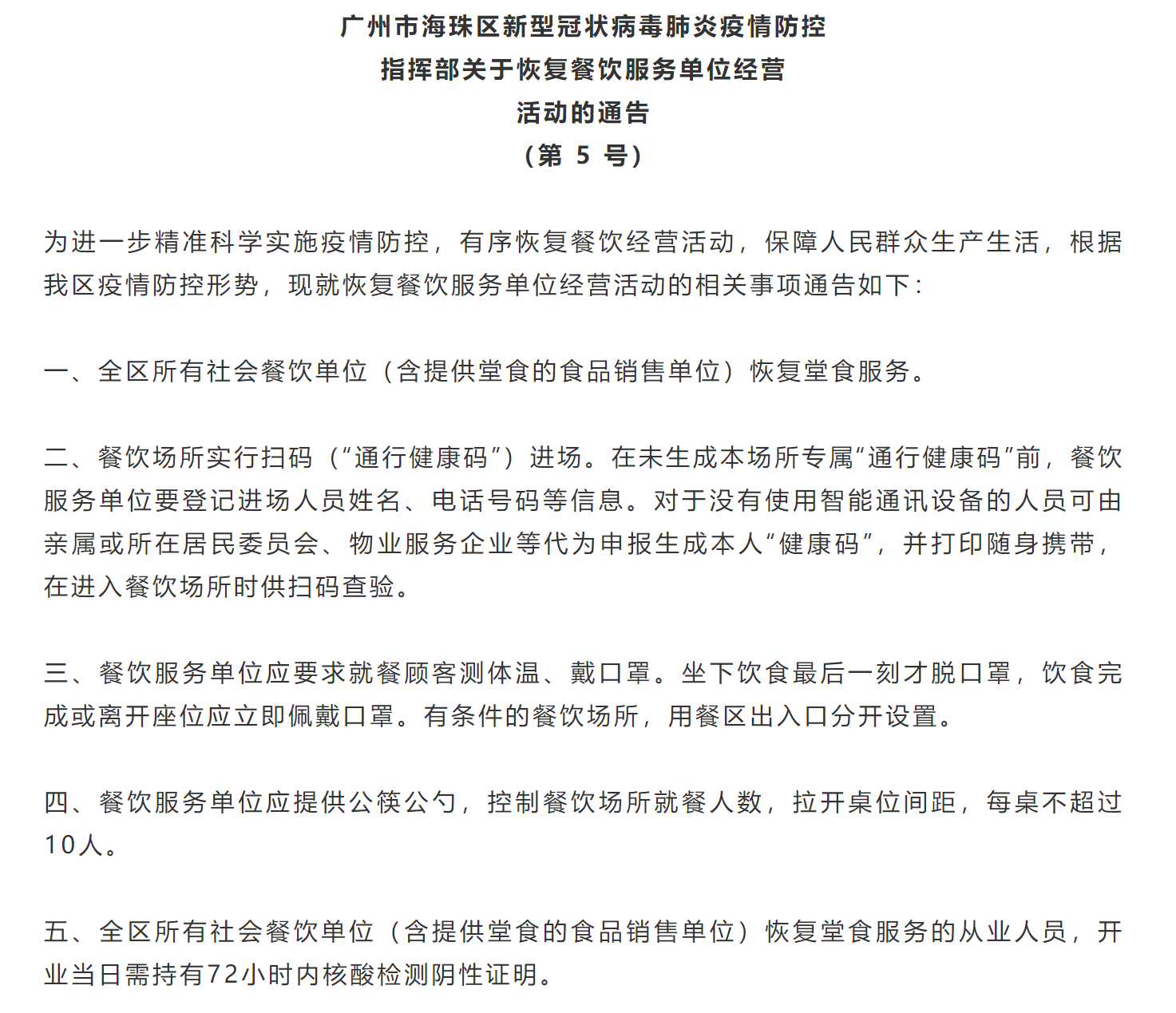 關(guān)于逐步放寬餐飲服務(wù)單位經(jīng)營(yíng)活動(dòng)的通告