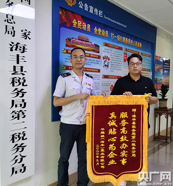 央廣網(wǎng)汕尾10月26日消息(記者官文清 通訊員陳思宇 童振躍)“海豐稅務(wù)人員主動(dòng)上門指導(dǎo)留抵退稅事宜,僅用兩天時(shí)間退稅款就到我們賬戶了,真金白銀落袋,為我們解決了復(fù)工后資金周轉(zhuǎn)的實(shí)際困難!苯眨A耀城(海豐)置業(yè)有限公司將一面印有“服務(wù)高效辦實(shí)事,真誠貼心為企業(yè)”的錦旗送至海豐縣稅務(wù)局第二稅務(wù)分局,對稅務(wù)人員真誠貼心、全面提速為企業(yè)排憂解難的服務(wù)表示充分肯定及衷心感謝。