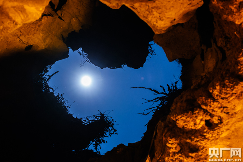 12月31日凌晨1點,晴朗的天空薄云飄動,一輪月亮掛于中天之上,經(jīng)由陰洞垂直照射至太極洞內(nèi),洞內(nèi)一眾天文愛好者、攝影愛好者長槍短炮準(zhǔn)備著,屏氣凝神地等待著見證這一天象奇觀。太極洞陰洞位于財神廟拜殿右側(cè),與地面相距約8米。由于太極洞的特殊地理位置,洞穴正好處于北回歸線以南一點,使得冬至節(jié)氣期間,月亮可以垂直照射洞底。