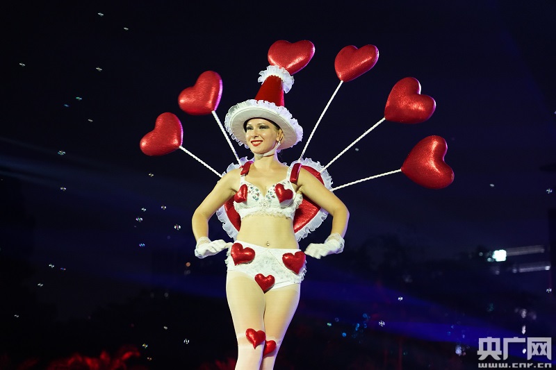 在電音節(jié)現(xiàn)場,幻彩的燈光和強勁的音浪,數(shù)百名來自世界各地的DJMC、模特、舞者悉數(shù)登上T臺與游客互動。記者注意到,在視覺和聽覺的雙重影響下,游客們紛紛揮舞手中的氣球棒,甚至身體也跟著搖擺起來。