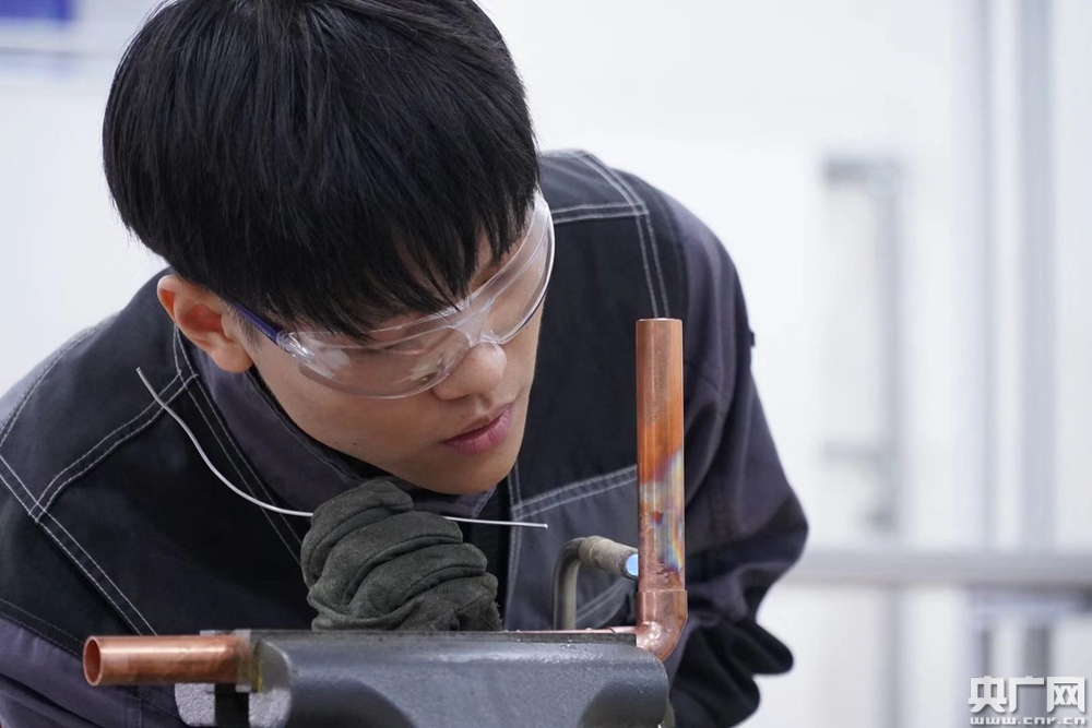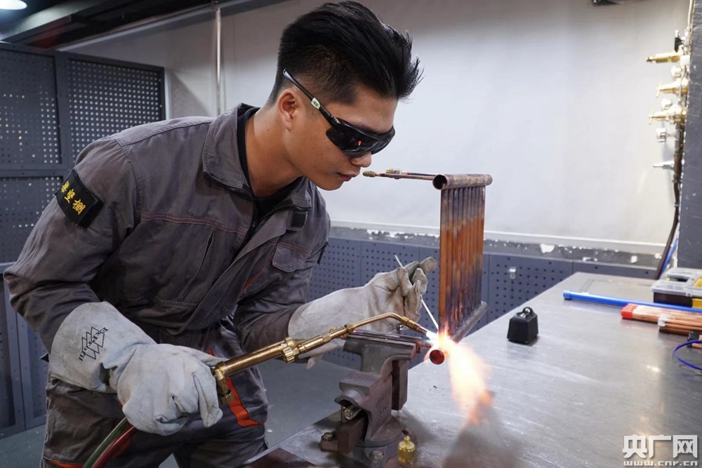 圖為參加第一屆全國技能大賽制冷與空調(diào)項(xiàng)目的選手正在焊接。(央廣網(wǎng)記者 官文清 攝)