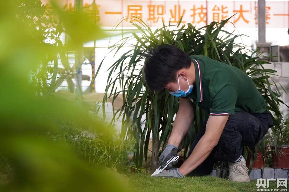 圖為參加第一屆全國技能大賽園藝項(xiàng)目的選手正在鋪裝草坪。(央廣網(wǎng)記者 官文清 攝)