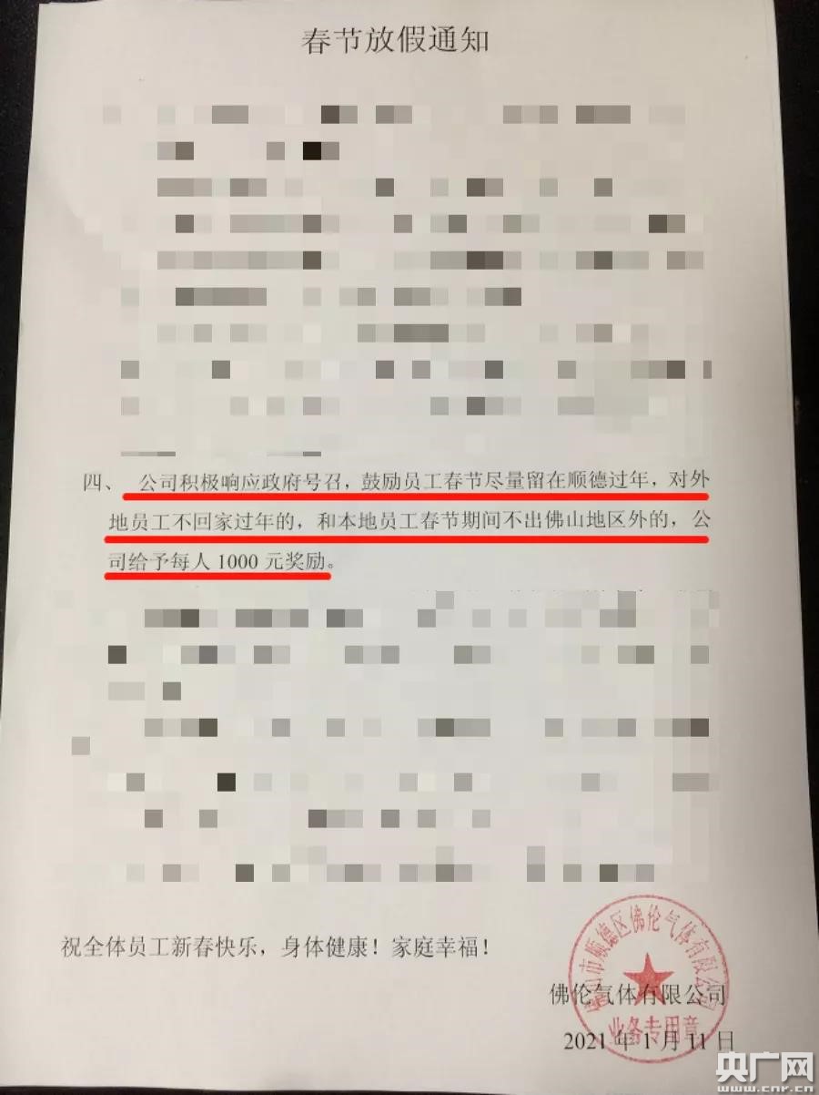 佛山順德一家企業(yè)推出暖心舉措,“真金白銀”獎勵留在本地過年的員工(央廣網(wǎng)發(fā) 受訪者供圖)