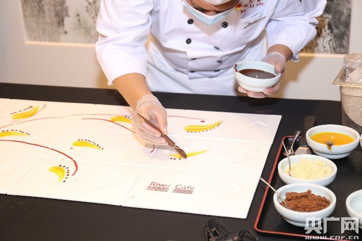 馮立新為選手們進行了西點拼盤制作表演。在馮立新舉重若輕、行云流水般的揮灑下,一臺惟妙惟肖、生動傳神的點心拼盤,猶如一幅藝術品很快完成。12只瓷碟拼起來是一幅畫,分開來則是一碟碟精彩各異的點心,其精妙之處,博得滿堂喝彩。