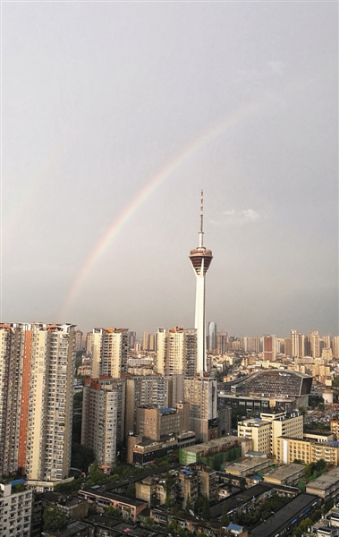 昨日雨后,彩虹掛在成都天空。本文圖片 成都商報