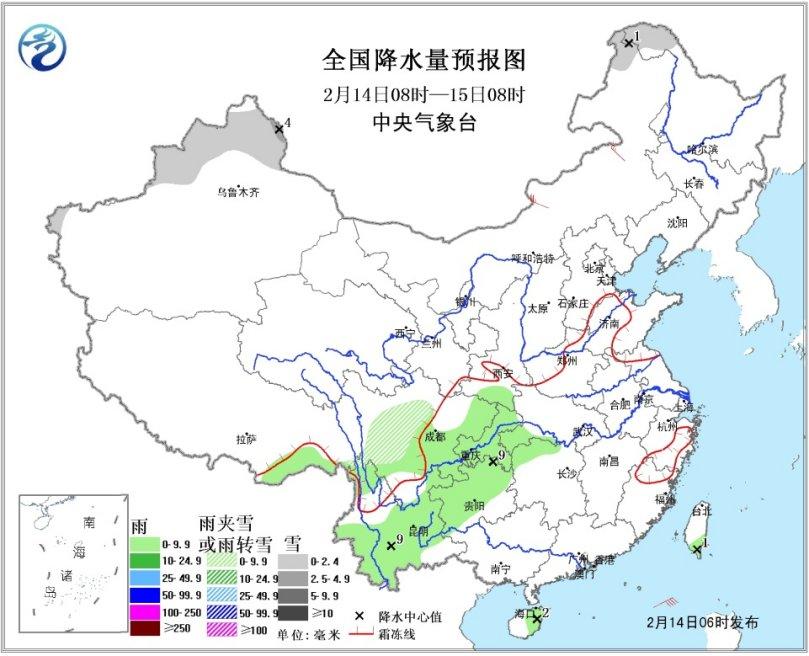 14日08時(shí)至15日08時(shí),北疆北部、川西高原中部等地有小雪或雨夾雪,局地中雪;西南地區(qū)東部和南部、西藏東南部、海南東部等地有小雨或陣雨。內(nèi)蒙古中東部有4-5級(jí)風(fēng)。(圖1)。