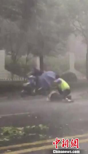 狂風(fēng)暴雨中,民警為倒地男子擋住了風(fēng)雨和過往車輛!∧繐粽咭曨l截圖 攝