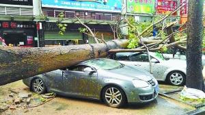 珠海市區(qū)幾輛小汽車被吹倒的樹木砸中。新華社發(fā)
