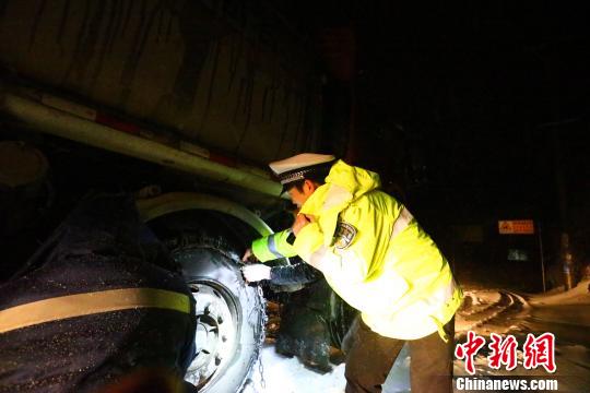 交警在積雪結(jié)冰道路險(xiǎn)段巡邏值守 榮滔 攝