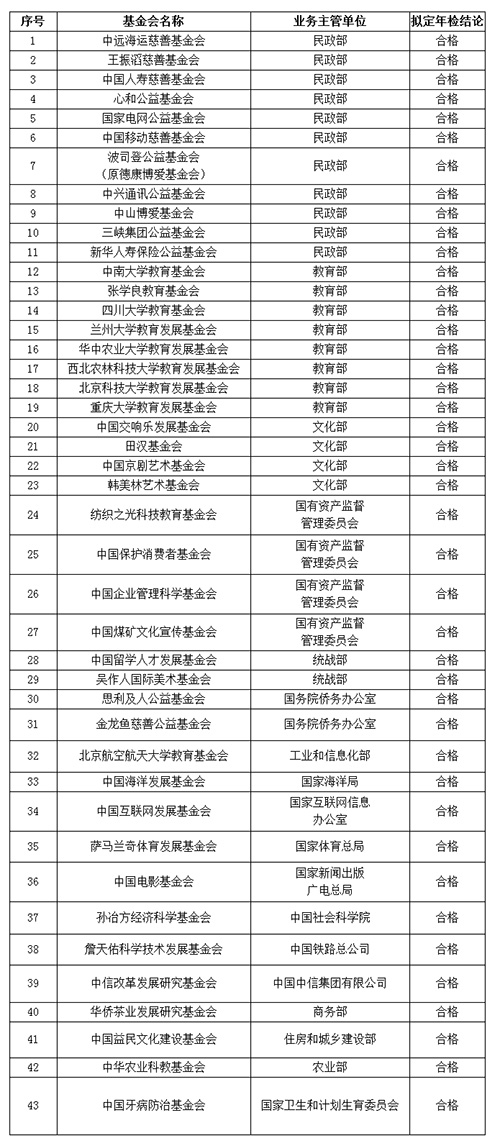 7月4日,民政部社會(huì)組織管理局對(duì)基金會(huì)2016年度檢查擬定結(jié)論予以公示,第一批43家基金會(huì)擬定年檢結(jié)論全部為合格。