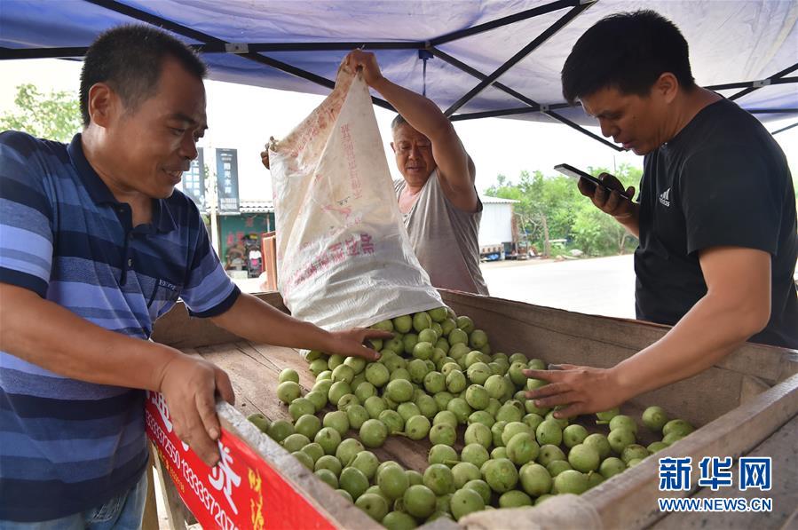 8月5日,在贊皇縣的核桃銷售點,核桃種植戶將核桃賣給經銷商。
