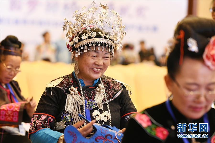 當日,第五屆貴州省婦女特色手工技能暨創(chuàng)新產(chǎn)品大賽在貴陽市舉行。來自貴州省各地的繡娘和染娘分別就民族刺繡、民族蠟染、創(chuàng)新產(chǎn)品設(shè)計等項目進行比拼,她們在現(xiàn)場飛針走線、巧手繪圖,展示貴州婦女特色手工之美。