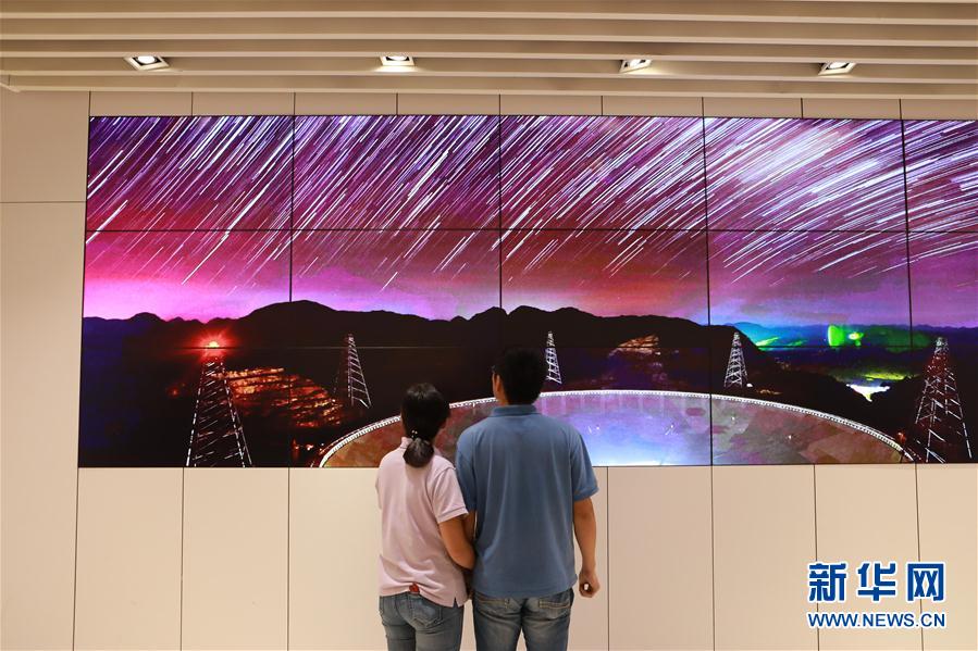 孫純(左)與石向瑋在FAST總控室內(nèi)觀看FAST全景圖(8月9日攝) 新華社記者張傳奇 攝 在世界最大單口徑射電望遠(yuǎn)鏡——500米口徑球面射電望遠(yuǎn)鏡(FAST)項(xiàng)目組,光信息科學(xué)專業(yè)畢業(yè)的孫純和熱能與動(dòng)力工程專業(yè)畢業(yè)的石向瑋因FAST結(jié)緣,在今年7月完婚。他們的結(jié)合,被同事們戲稱為“光”與“熱”的結(jié)合! -