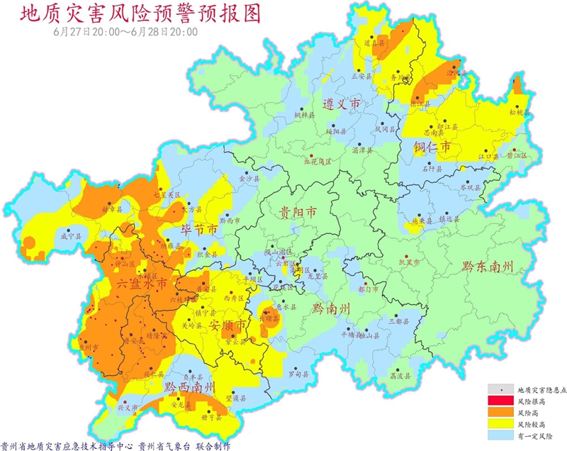 具體預(yù)警內(nèi)容為,6月27日20時(shí)至6月28日20時(shí),六枝、盤州、織金、普安、晴隆、興仁、關(guān)嶺、普定、西秀、鎮(zhèn)寧、紫云等貴州11個(gè)縣(區(qū)、市、特區(qū))發(fā)生山洪災(zāi)害的可能性較大,為黃色預(yù)警。