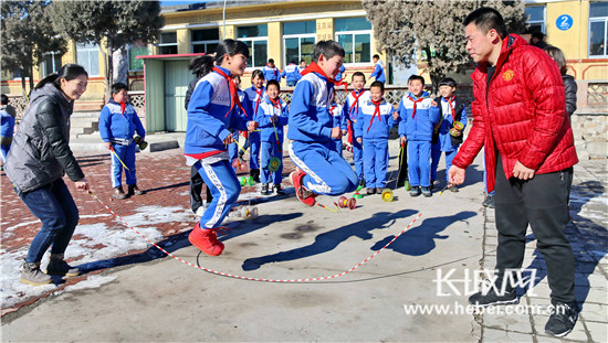 大學(xué)生志愿者與學(xué)生們共同跳大繩。曹建雄