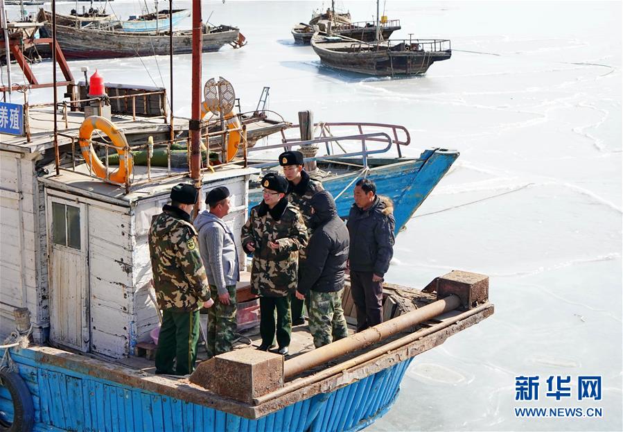 1月29日,河北省秦皇島邊防支隊(duì)北戴河邊防派出所官兵在轄區(qū)漁船碼頭提醒漁民寒潮冰期安全事項(xiàng)。新華社記者 楊世堯 攝 -