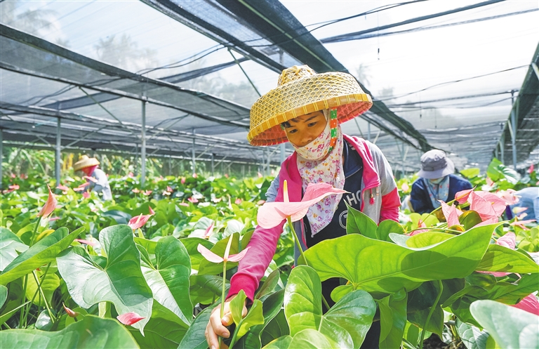 日前,農(nóng)戶在三亞天涯區(qū)紅掌扶貧產(chǎn)業(yè)基地采收紅掌。