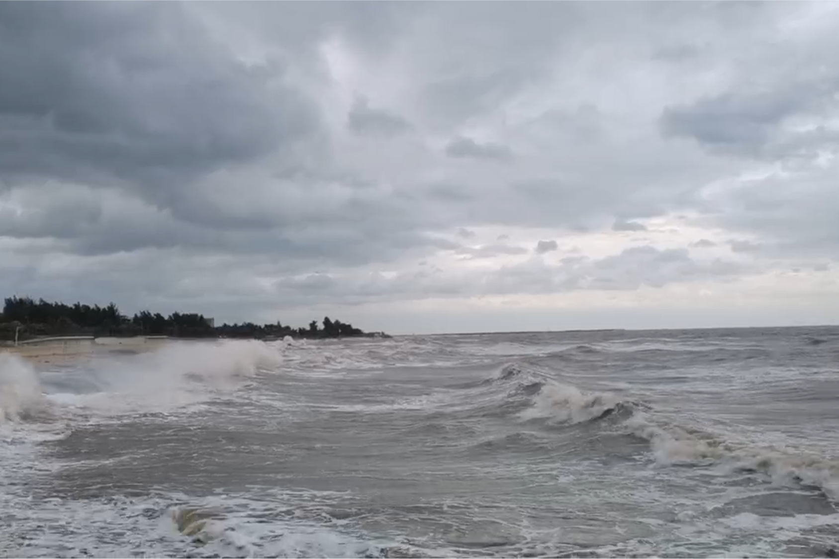 記者在海邊看到巨浪翻滾、狂風(fēng)驟雨。