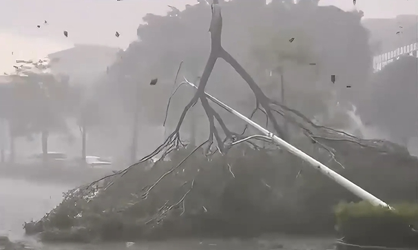 文昌市狂風(fēng)大作,廣告牌飛舞、樹木倒塌。