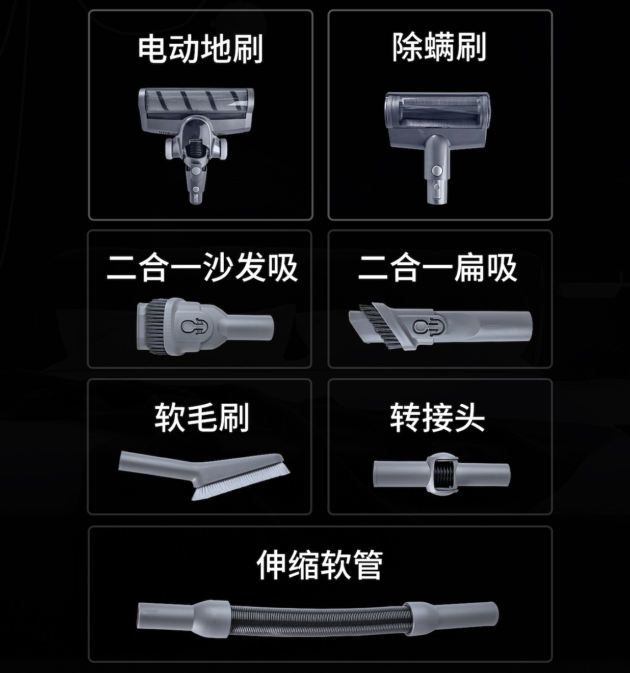 搭配多種刷頭,全屋清潔:地面、沙發(fā)、桌面、書柜、車內(nèi)、床底低矮空間。