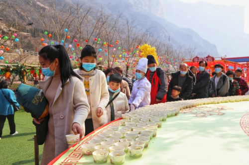 “熱騰騰的餃子來嘍!”一聲響亮的吆喝,一碗碗熱氣騰騰的餃子依次排開,游客有序排隊領餃子、吃餃子,每個人的臉上都洋溢著節(jié)日的喜悅……在河南寶泉景區(qū),這樣的一幕從年三十開始,每天飯點兒時間都會準時上演。