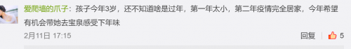 網(wǎng)友@愛爬墻的爪子:孩子今年3歲,還不知道啥是過年,第一年太小,第二年疫情完全居家,今年希望有機會帶她去寶泉感受下年味