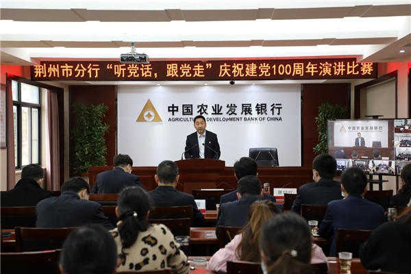 百年大黨,征途如虹。為隆重慶祝中國共產(chǎn)黨百年華誕,深入推進(jìn)黨史學(xué)習(xí)教育,引導(dǎo)黨員干部學(xué)史明理、學(xué)史增信、學(xué)史崇德、學(xué)史力行,3月31日,農(nóng)發(fā)行荊州市分行舉辦了“聽黨話、跟黨走”慶祝建黨100周年演講比賽,來自全市7個(gè)支行黨支部和2個(gè)機(jī)關(guān)黨支部共10名選手參賽。