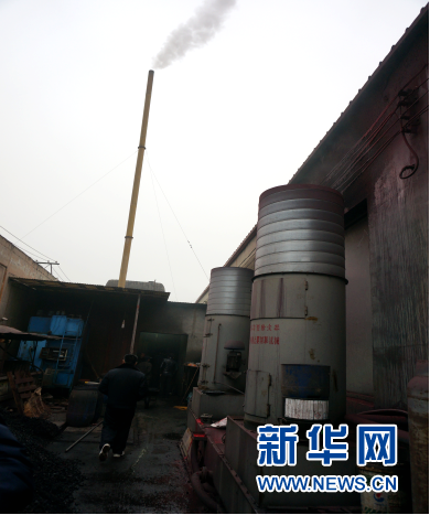 20日,一家工廠內(nèi)的煙囪正冒著黑煙,督查組人員進行突擊檢查。新華網(wǎng)記者袁晗攝