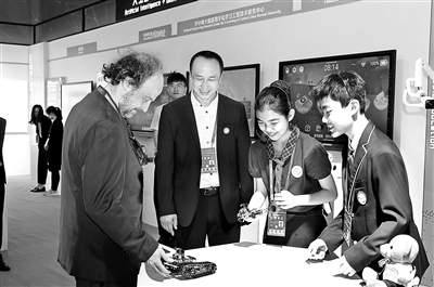 昨天上午,國際人工智能與教育大會展覽正式開展。在此次展覽中唯一的基礎(chǔ)教育領(lǐng)域代表、北京市第十八中學(xué)的展位上,兩名同學(xué)操作的超聲波避障小車吸引了不少參觀者駐足。北京青年報記者在現(xiàn)場看到,兩部小車在同學(xué)們的操作下成功避開障礙物,“我們是通過超聲波傳感器的感應(yīng)控制,模擬無人駕駛汽車對于感知避障的工作原理而做成的。”一位初二年級的同學(xué)介紹。