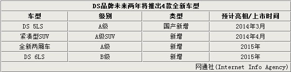 目前DS在華共推出了DS3、DS4、DS5三款車型,其中DS5已正式在華投產(chǎn),而在2015年前其還將推出4款全新車型,其中關(guān)于該品牌旗下的首款SUV產(chǎn)品,長安標(biāo)致雪鐵龍總裁埃里克·阿博德(Eric APODE)先生表示:2014年,我們將發(fā)布一款緊湊型SUV,它將會是一款全球化車型,但是會率先在中國市場發(fā)布上市。另外全新兩廂車、DS 5LS以及DS 6LS也均有望在華引入或進行投產(chǎn)。