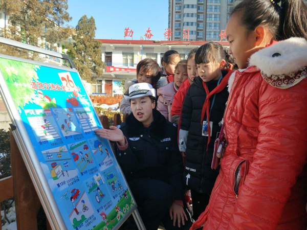 進入2018年,連續(xù)下雪道路冰凍,登封交警制作出雨雪冰凍天氣出行安全提示宣傳圖版,走進該市各小學,F(xiàn)場講解,受到家長和學校師生的歡迎。
