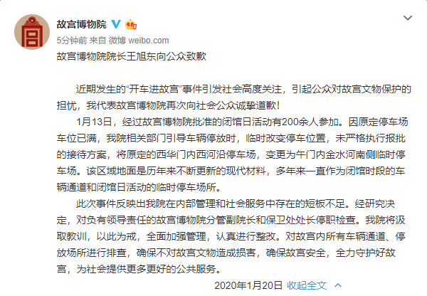 央視網(wǎng)消息:1月21日,針對近期發(fā)生的“開車進故宮”事件,故宮博物院院長王旭東在微博發(fā)出致歉聲明,全文如下: