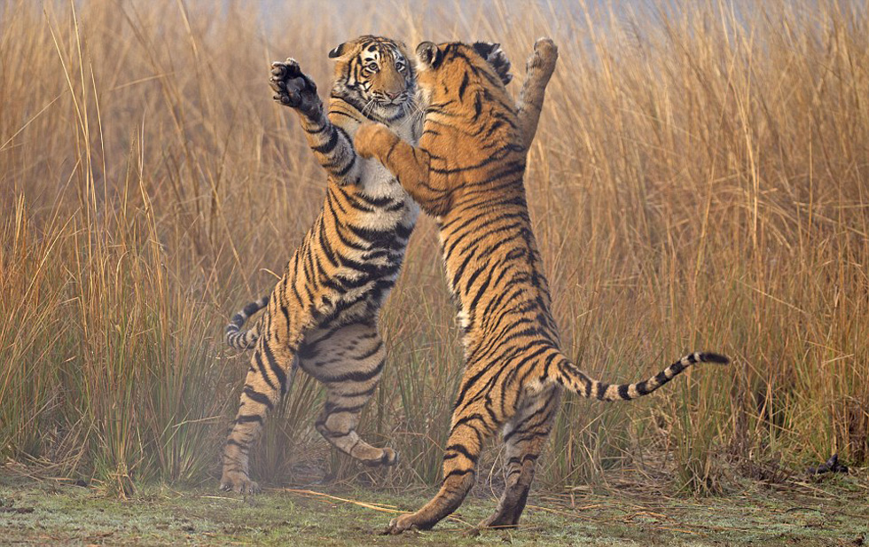 野生動物攝影師安迪·洛茲自從兩只小老虎去年出生以來,就一直在密切關(guān)注著它們的成長。他用鏡頭記錄下了這一畫面。雖然從舞蹈的嚴(yán)格意義上來評斷,這兩只小老虎的“舞”技一般,但它們在“舞蹈”中所散發(fā)出的熱情值得稱贊。而且,看上去它們的律動感不錯,配合地也相當(dāng)有默契。(國際在線專稿 米粒)