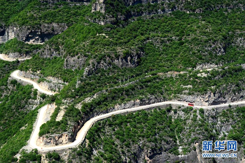 5月16日,一輛汽車在山西省平順縣的虹梯關(guān)“掛壁公路”行駛。山西省平順縣的虹梯關(guān)“掛壁公路”位于太行山峭壁之上,長(zhǎng)度約10公里,鑿山穿洞,道路艱險(xiǎn),風(fēng)光獨(dú)特。 新華社發(fā)(梁棟 攝)