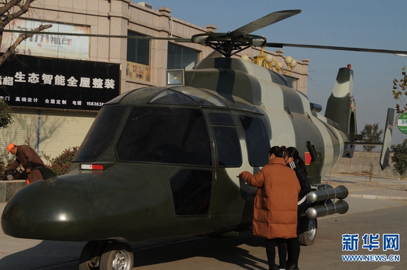 12月6日拍攝的河南省內(nèi)黃縣農(nóng)民王志勇和父親制造的“直升機”。據(jù)介紹,王志勇和父親平常都喜歡鉆研機械,今年7月份,他們開始購買鐵皮材料,自己設(shè)計制造直升飛機模型。完工后,直升機模型長13.5米,高3米,重5噸左右,機艙被設(shè)計成一個影院,有6個座位。新華網(wǎng)發(fā)(劉肖坤 攝) -