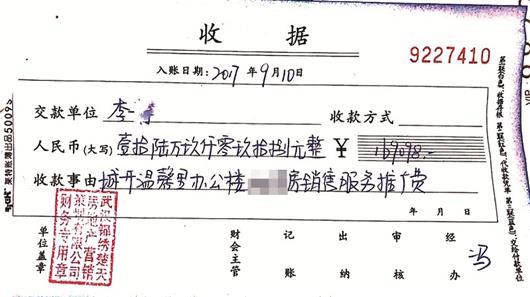 李女士提供的購房合同顯示:去年9月10日,她與武漢市城開房地產(chǎn)開發(fā)有限公司簽訂購房協(xié)議,購買了一套37.05平方米的公寓式辦公樓,使用年限為40年。在支付460902元的購房款后,還支付了169098元的銷售服務(wù)推廣費(fèi)(見收據(jù))。