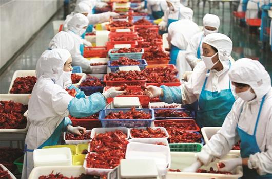 湖北日?qǐng)?bào)訊 圖為:潛江小龍蝦加工現(xiàn)場(chǎng)