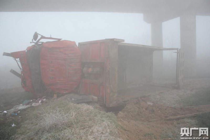 7時46分,消防官兵到達救援現(xiàn)場后發(fā)現(xiàn),一輛貨車側翻在高架橋路下的深溝里,駕駛室被橋底的石柱穿過,被困司機生死未卜。交警已將現(xiàn)場封鎖,120醫(yī)務人員也在現(xiàn)場待命。經現(xiàn)場偵查,一名中年男子被卡在駕駛室,醫(yī)務人員已經對其進行止血。根據(jù)現(xiàn)場情況,消防指揮員迅速確定救援方案,對嚴重變形的駕駛室進行破拆。消防官兵手持液壓擴張器變形的駕駛室進行擴張,擴大了救援空間。最終,在現(xiàn)場救援人員的共同努力下,被困人員于7時57分成功獲救,被送上救護車前往醫(yī)院救治。由于清晨正值大霧、霜降,地面濕滑前方能見度不足50米,此時貨車車速較快,在看見橋面時已經來不及剎車,導致貨車沖出橋面,釀成本次事故的發(fā)生。
