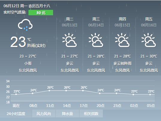 具體預(yù)報(bào):12日白天多云有陣雨,氣溫23℃—27℃,偏北風(fēng)2—3級;12日晚到13日白天陣雨轉(zhuǎn)多云,氣溫23℃—28℃,偏北風(fēng)2—3級;13日晚到14日白天多云,氣溫21℃—28℃,偏北風(fēng)2—3級。