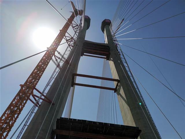 “在整個(gè)主塔施工過程中,難度最大的還是深水基礎(chǔ)施工!蓖舴歼M(jìn)介紹,普通長(zhǎng)江大橋圍堰一般下放嵌入河床深度大多較淺,鳊魚洲長(zhǎng)江大橋4號(hào)主塔墩圍堰下放嵌入河床深度達(dá)16.5米,圍堰設(shè)計(jì)抽水水位水頭差達(dá)35米,是國(guó)內(nèi)抽水水頭差最大的矩形雙壁鋼圍堰。圍堰下放過程中,項(xiàng)目部采用吸泥機(jī)加絞吸泵的工藝方法在圍堰內(nèi)外24小時(shí)連續(xù)作業(yè),歷經(jīng)30個(gè)晝夜,將長(zhǎng)59.4米、寬40.6米、重達(dá)4800噸的矩形鋼圍堰精準(zhǔn)下沉到位。