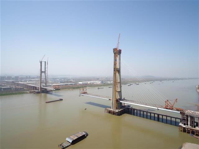 據(jù)介紹,安九鐵路鳊魚洲長(zhǎng)江大橋2017年10月開工建設(shè),預(yù)計(jì)年內(nèi)大橋主體工程完工。大橋北側(cè)位于湖北黃梅縣,南側(cè)位于江西九江市。大橋?yàn)樗木鐵路大橋,其中兩線為高鐵線,時(shí)速350公里;預(yù)留兩線為客貨線,時(shí)速200公里。鳊魚洲長(zhǎng)江大橋?yàn)橹骺?72米、全長(zhǎng)1320米的雙塔雙索面交叉索斜拉橋,是國(guó)內(nèi)首座交叉索斜拉橋。