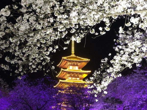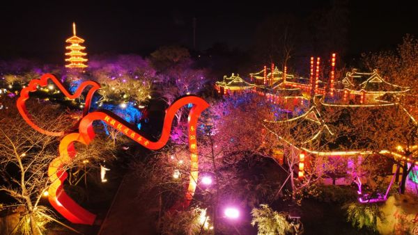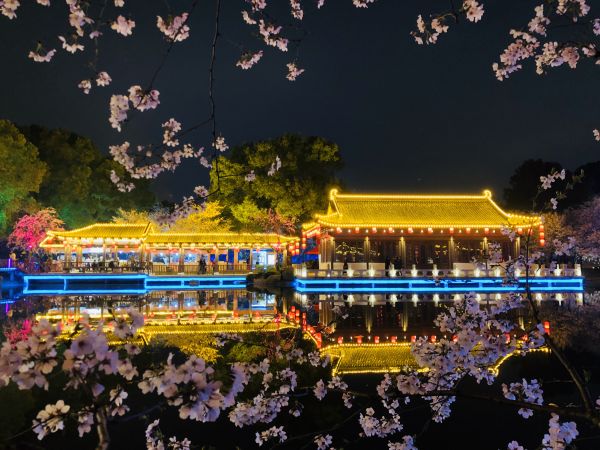 “白天賞櫻花本身,夜間賞櫻花園意境。”傍晚時(shí)分,暮色將櫻園籠罩,園內(nèi)彩燈盡數(shù)亮起,423畝東湖櫻花園被瞬間點(diǎn)亮。白天內(nèi)斂典雅的曲院櫻艷張揚(yáng)了起來,飛檐上掛著紅彤彤的燈籠,與極具古風(fēng)的仙鶴畫舫交相輝映;五重塔靜靜矗立,描金勾勒出東湖櫻花園最亮眼的部分;花溪流水潺潺,倒映出五彩斑斕的燈影,如夢如幻。