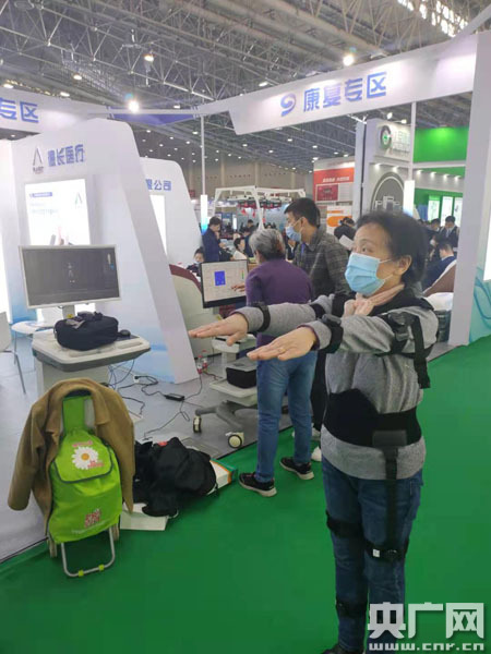 在位于醫(yī)療器械展館的智能化康復訓練器械體驗區(qū),家住武漢硚口區(qū)的王阿姨正在體驗三維步態(tài)評估儀,只見她身穿感應裝置做出各種動作,位于左側(cè)的顯示屏上一個數(shù)據(jù)小人正隨她的動作改變形態(tài)!斑@是我們公司最新研發(fā)的三維步態(tài)評估儀,使用者只需簡單穿戴數(shù)據(jù)傳輸裝置并做出動作,智能計算機便可根據(jù)其動作幅度判斷受評者關(guān)節(jié)部位是否發(fā)生病變!痹撊S步態(tài)評估儀生產(chǎn)商說。
