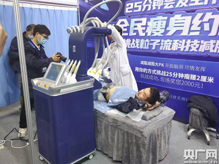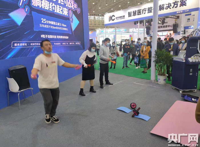 “加油跳,跳滿25分鐘,只要沒有像他們說的減脂成功,我們就能得到獎勵”在該展館的醫(yī)普茂展區(qū),一名參與“全民瘦身約戰(zhàn)”的女孩對同伴喊道;顒蝇F(xiàn)場,不少參觀者踴躍參加25分鐘減圍挑戰(zhàn),但在經(jīng)過約十分鐘的跳繩與搖健身環(huán)后均“敗下陣來”。隨后,該參展商向大家介紹了核心“黑科技”——粒子流轟脂科技,并邀請參展人群進行體驗。